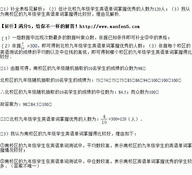 (3)你认为哪个校区的九年级学生英语单词掌握得比较好?说明你的理由.(至少从两个不同的角度说明推断的合理性)