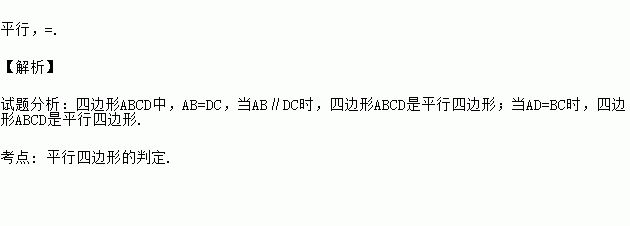 四边形ABCD中,如果AB=DC,当AB________DC时,四边形ABCD是平行四边形;当AD________BC时,四边形ABCD是平行四边形.