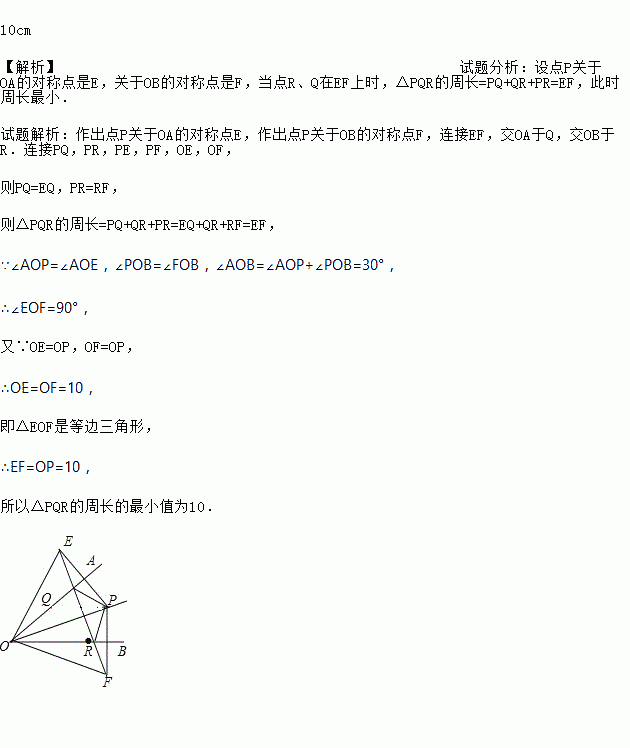 如图,∠AOB=30°,角内有一点P,PO=10cm,两边上各有一点Q,R(均不同于点O),则△PQR的周长的最小值是多少?