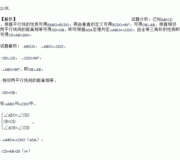 Èçͼ,AB¡ÎOH¡ÎCD,ÏàÁÚÁ½Æ½ÐÐÏß¼äµÄ¾àÀëÏàµÈ,AC,BDÏཻÓÚO,OD¡ÍCD,´¹×ãΪD,ÒÑÖªAB=20Ã×,Çë¸ù¾ÝÉÏÊöÐÅÏ¢Çó±êÓïCDµÄ³¤¶È.