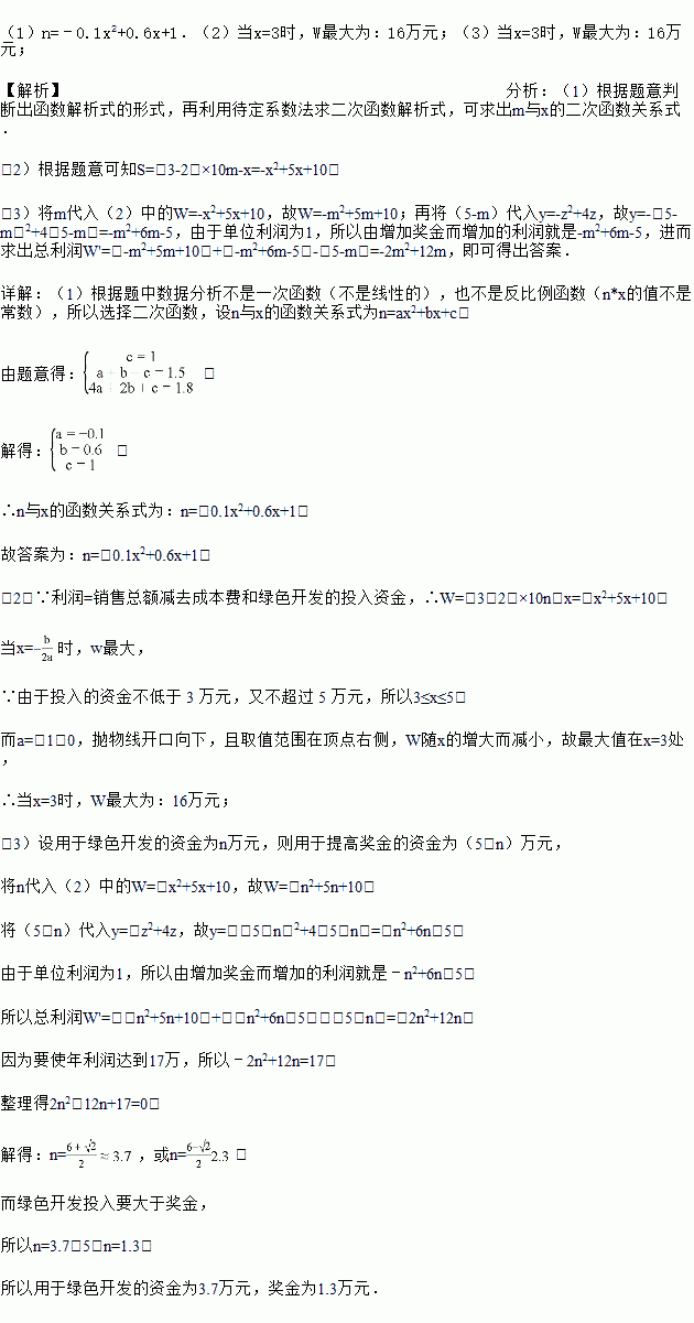 某种植基地种植一种蔬菜,它的成本是每千克2元,售价是每千克3元,年销量为10 (万千克).基地准备拿出一定的资金作绿色开发,若每年绿色开发投入的资金为x (万元),该种蔬菜的年销量将是原年销量的n倍,x与n的关系如下表: