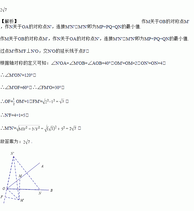 如图,∠AOB=40°,M、N分别在OA、OB上,且OM=2,ON=4,点P、Q分别在OB、OA上,则MP+PQ+QN的最小值是 __________.