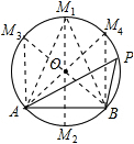 如图,点A、B、P在⊙O上,且∠APB=50°。若点M是⊙O上的动点,要使△ABM为等腰三角形,则所有符合条件的点M有 ( )![]()