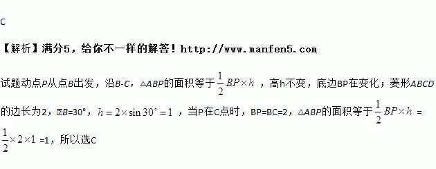 如图,菱形ABCD的边长为2,∠B=30°.动点P从点B出发,沿 B-C-D的路线向点D运动.设△ABP的面积为y(B、P两点重合时,△ABP的面积可以看作0),点P运动的路程为x,则y与x之间函数关系的图像大致为( )