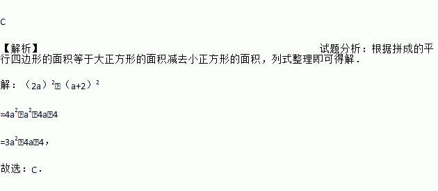 C 【解析】试题分析:根据拼成的平行四边形的面积等于大正方形的面积减去小正方形的面积,列式整理即可得解. 【解析】 (2a)2﹣(a+2)2 =4a2﹣a2﹣4a﹣4 =3a2﹣4a﹣4, 故选:C.