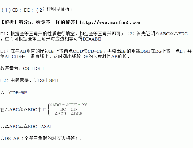 小明家门前有一条小河,村里准备在河面上架上一座桥,但河宽AB无法直接测量,爱动脑的小明想到了如下方法:在与AB垂直的岸边BF上取两点C、D使CD= ,再引出BF的垂线DG,在DG上取一点E,并使A、C、E在一条直线上,这时测出线段 的长度就是AB的长.