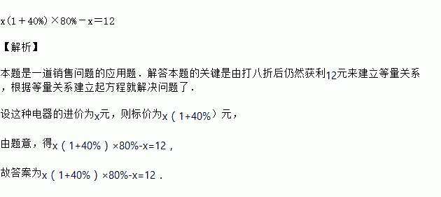 “五一”节期间,某电器按进价提高40%后标价,然后打八折卖出,如果仍能获利12元,设这种电器的进价为x元,则可列出方程为_____.