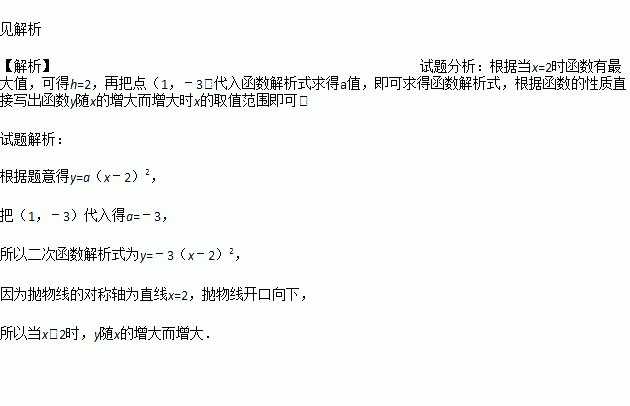 已知二次函数y=a(x﹣h)2,当x=2时有最大值,且此函数的图象经过点(1,﹣3),求此二次函数的关系式,并指出当x为何值时,y随x的增大而增大.