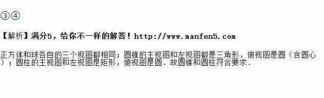 如图,四个几何体中,它们各自的三个视图(主视图、左视图和俯视图)有两个相同,而另外一个不同的几何体是________.(填写序号)