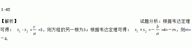 3 -4. 【解析】试题分析:根据韦达定理可得: ·==3,则方程的另一根为3;根据韦达定理可得: +=-=4=-m,则m=-4.