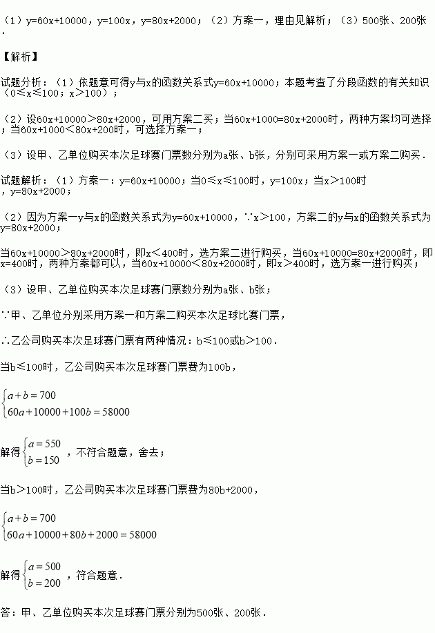 (3)甲、乙两单位分别采用方案一、方案二购买本场足球赛门票共700张,花去总费用计58000元,求甲、乙两单位各购买门票多少张.