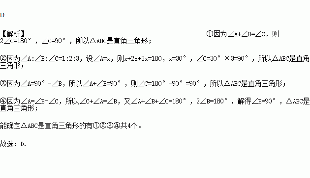 在下列条件中:①∠A +∠B=∠C;②∠A:∠B:∠C=l:2:3;③∠A=90°-∠B;④∠A=∠B=