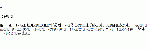 如图,把一张矩形纸片ABCD沿EF折叠后,点A落在CD边上的点A′处,点B落在点B′处,若∠2=40°,则图中∠1的度数为( )