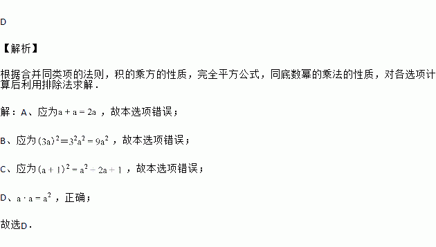 A. a+a=a2 B. (3a)2=6a2 C. (a+1)2=a2+1 D. a•a=a2
