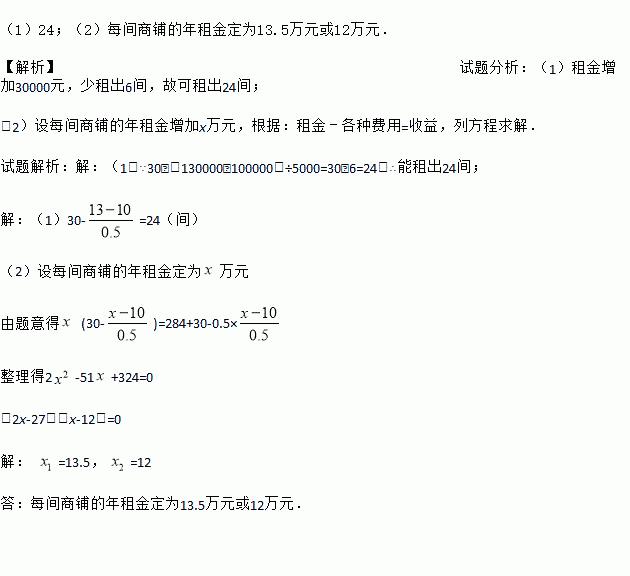 (1)24;(2)每间商铺的年租金定为13.5万元或12万元. 【解析】试题分析:(1)租金增加30000元,少租出6间,故可租出24间; (2)设每间商铺的年租金增加x万元,根据:租金﹣各种费用=收益,列方程求解. 试题解析:【解析】 (1)∵30﹣(130000﹣100000)÷5000=30﹣6=24,∴能租出24间; 【解析】 (1)30-=24(间) (...