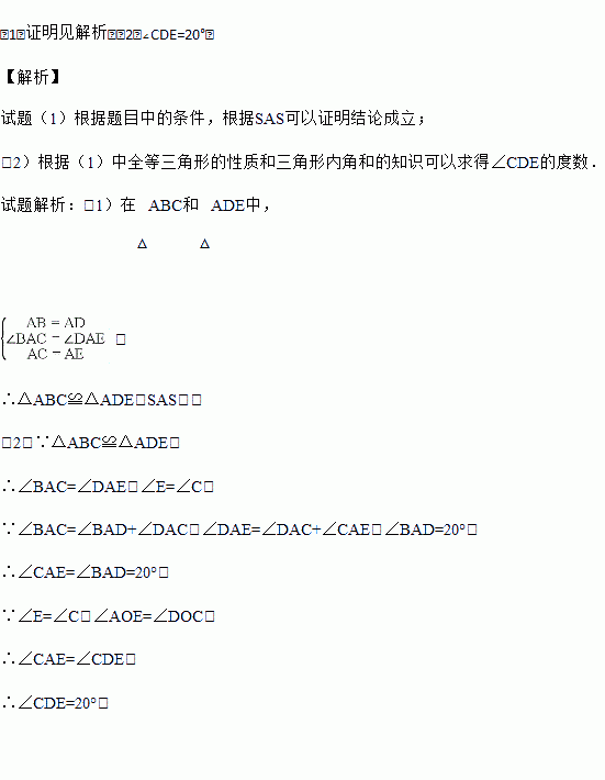 如图所示,已知△ABC中,D为BC上一点,E为△ABC外部一点,DE交AC于一点O,AC=AE,AD=AB,∠BAC=∠DAE.