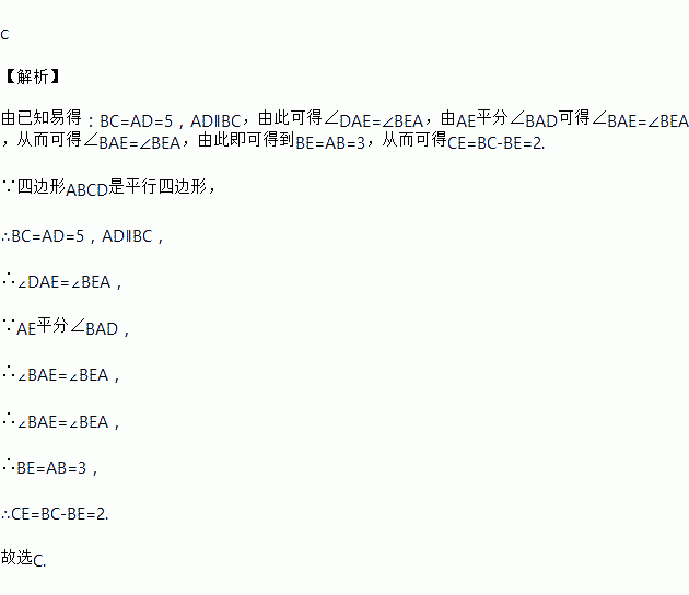 如图,在平行四边形ABCD中,AD=5,AB=3,AE平分∠BAD交BC边于点E,则线段BE,EC的长度分别为( )