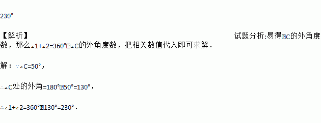 如图,在△ABC中,∠C=50°,按图中虚线将∠C剪去后,∠1+∠2等于 °.
