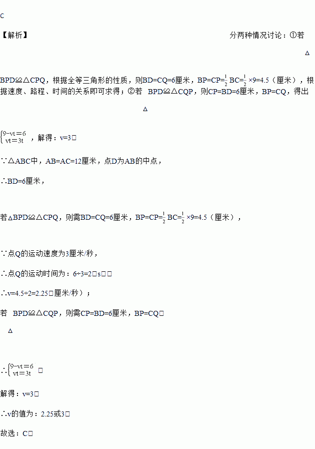 △ABC中,AB=AC=12厘米,∠B=∠C,BC=9厘米,点D为AB的中点如果点P在线段BC上以v厘米![]()