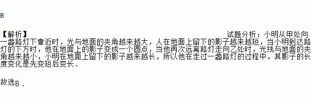如图,夜间小明在路灯下由甲处走到乙处,他在地面上的影子( )