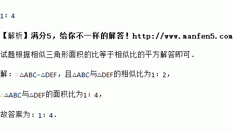 若△ABC∽△DEF,且△ABC与△DEF的相似比为1:2,则△ABC与△DEF的面积比为________.