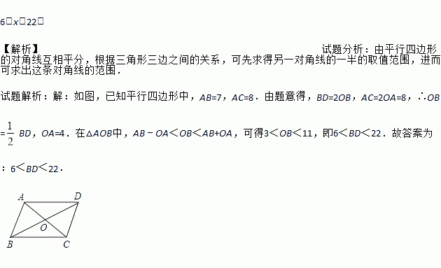 已知某个平行四边形的一边长为7,一条对角线长为8,求另一条对角线长的取值范围.