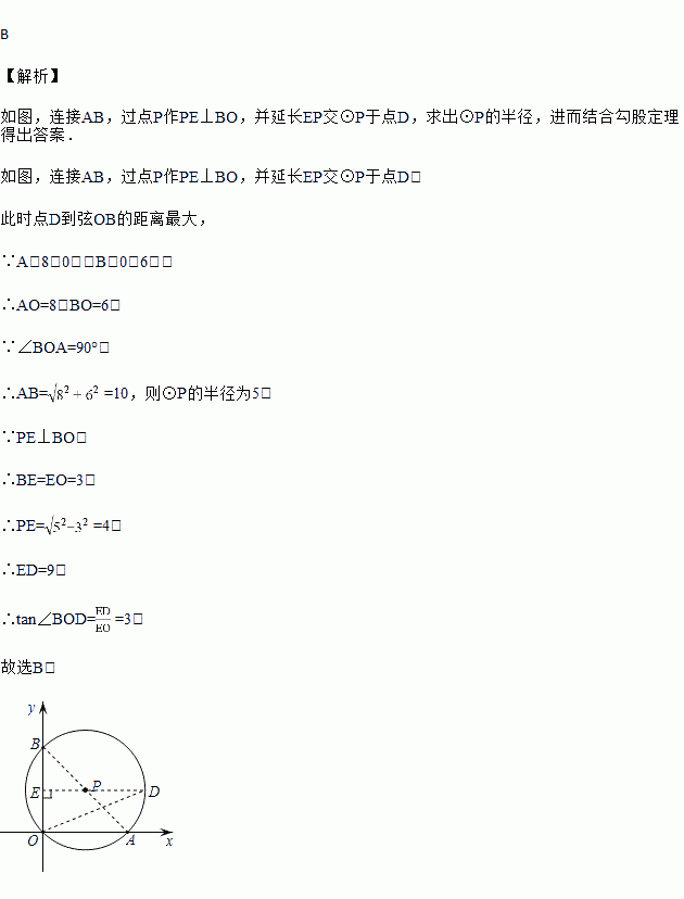 如图,平面直角坐标系中,⊙P经过三点A(8,0),O(0,0),B(0,6),点D是⊙P上的一动点.当点D到弦OB的距离最大时,tan∠BOD的值是( )