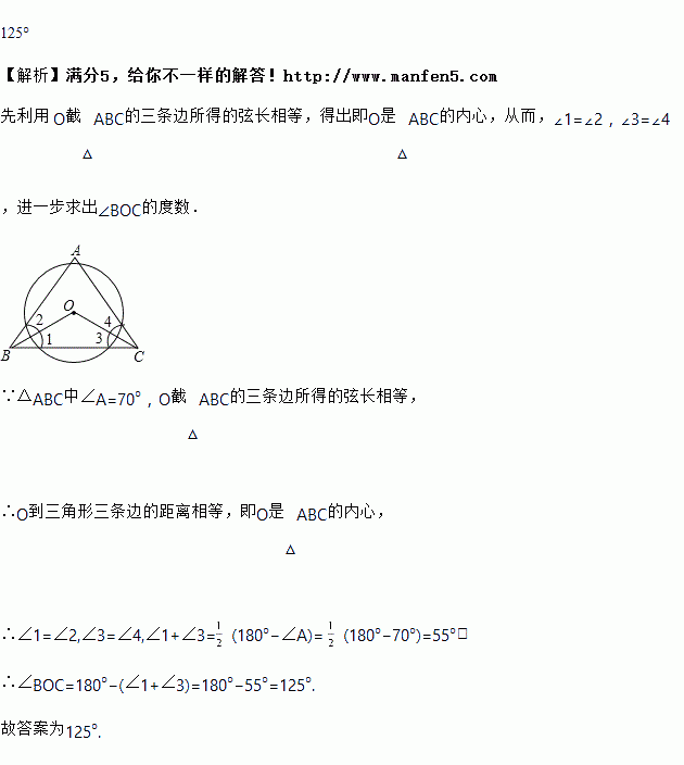 如图,△ABC中,∠A=70°,⊙O截△ABC的三条边所截得弦长相等,则∠BOC=__.
