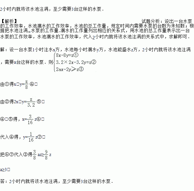 某工厂一蓄水池有漏水现象,如果用一台水泵向该水池注水,需用8小时才能将空水池注满,如果用同样的两台水泵向该水池注水,只需3.2小时就能将空池注满,如要求2小时内就将该水池注满,至少需要几台这样的水泵?