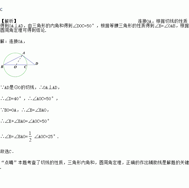 如图,已知BC是⊙O的直径,AB是⊙O的弦,切线AD交BC的延长线于D,若∠D=400,则∠B的度数是( )