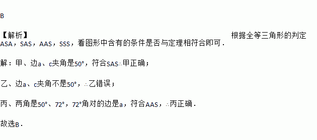 B ¡¾½âÎö¡¿¸ù¾ÝÈ«µÈÈý½ÇÐεÄÅж¨ASA£¬SAS£¬AAS£¬SSS£¬¿´Í¼ÐÎÖк¬ÓеÄÌõ¼þÊÇ·ñÓ붨ÀíÏà·ûºÏ¼´¿É£® ¡¾½âÎö¡¿ ¼×¡¢±ßa¡¢c¼Ð½ÇÊÇ50¡ã£¬·ûºÏSAS¡à¼×ÕýÈ·£» ÒÒ¡¢±ßa¡¢c¼Ð½Ç²»ÊÇ50¡ã£¬¡àÒÒ´íÎó£» ±û¡¢Á½½ÇÊÇ50¡ã¡¢72¡ã£¬72¡ã½Ç¶ÔµÄ±ßÊÇa£¬·ûºÏAAS£¬¡à±ûÕýÈ·£® ¹ÊÑ¡B£®
