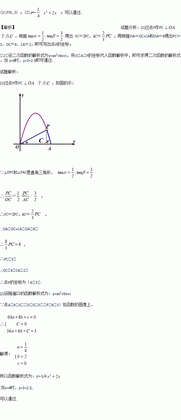 如图所示,是某市一条高速公路上的隧道口在平面直角坐标系上的示意图,路面OA宽8m,P处有一照明灯,从O、A两处观测P处,仰角分别为