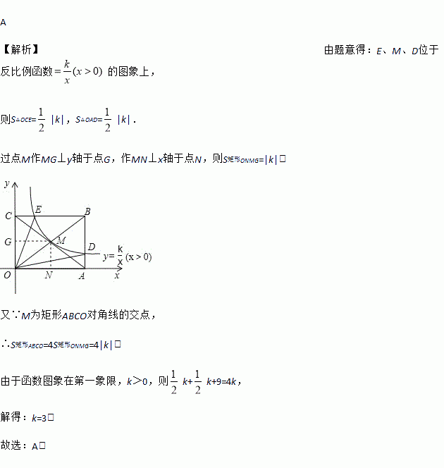 如图,反比例函数 的图象经过矩形OABC对角线的交点M,分别于AB、BC交于点D、E,若四边形ODBE的面积为9,则k的值为( )