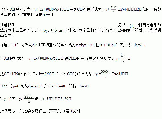 (2)若学生的注意力指数不低于40为高效时间,根据图中信息,求出一般情况下,完成一份数学家庭作业的高效时间是多少分钟?