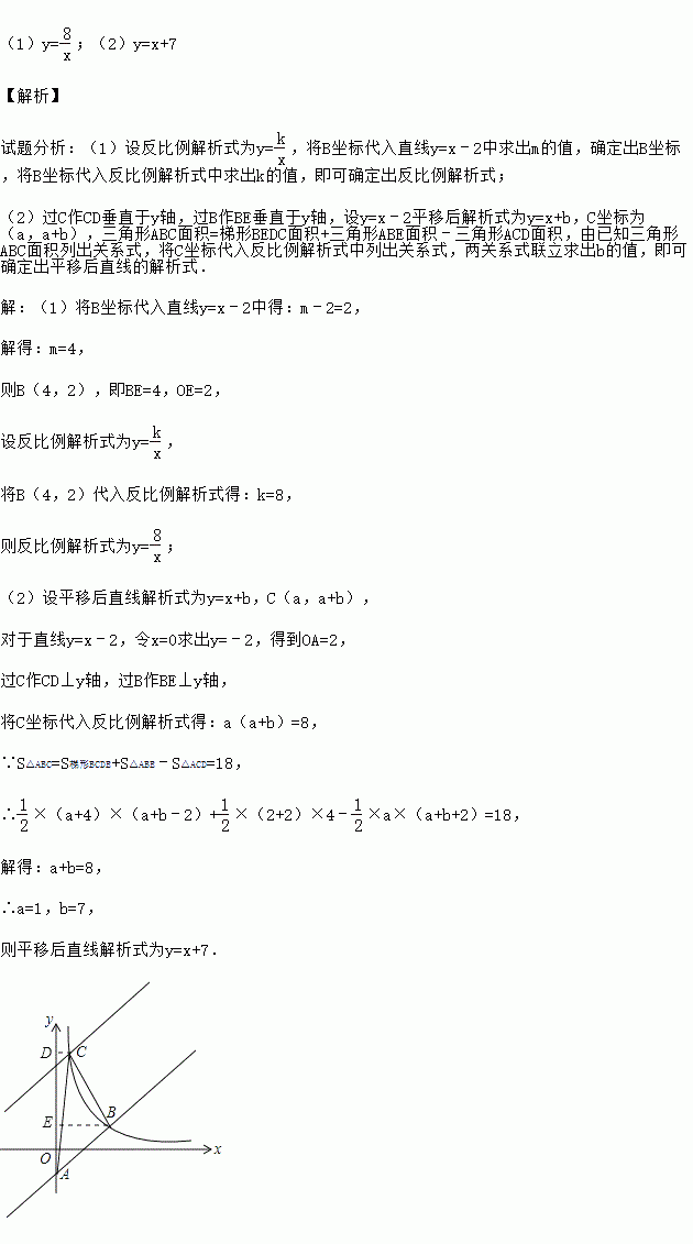 (2)将直线y=x﹣2向上平移后与反比例函数图象在第一象限内交于点C,且△ABC的面积为18,求平移后的直线的函数关系式.
