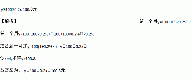 y=100+0.2x 100.8元 【解析】第一个月y=100+100×0.2℅, 第二个月y=100+100×0.2℅+〔100+100×0.2℅〕×0.2℅ 结合题干可知y=100(1+0.2℅x)= y=100+0.2x, 令x=4,求得y=100.8. 故答案为: y=100+0.2x;100.8元.