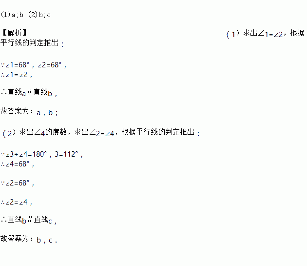 (1)a;b (2)b;c 【解析】(1)求出∠1=∠2,根据平行线的判定推出: ∵∠1=68°,∠2=68°, ∴∠1=∠2, ∴直线a∥直线b, 故答案为:a,b; (2)求出∠4的度数,求出∠2=∠4,根据平行线的判定推出: ∵∠3+∠4=180°,3=112°, ∴∠4=68°, ∵∠2=68°, ∴∠2=∠4, ∴直线b∥直线c, 故答案为:b,c...