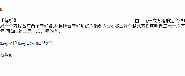 方程2x-=0, 3x+y=0, 2x+xy=1, 3x+y-2x=0, x2-x+1=0中,二元一次方程的个数是( )