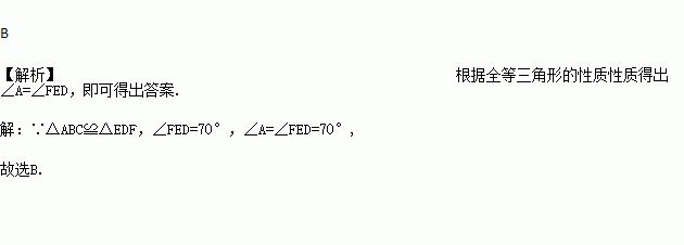 如图,△ABC≌△EDF,∠FED=70°,则∠A的度数是( )