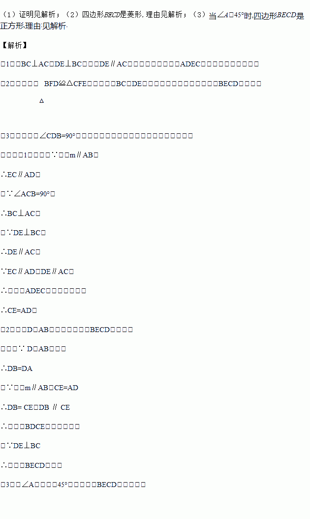 (3)若D为AB中点,则当∠A的大小满足什么条件时,四边形BECD是正方形?请说明你的理由.