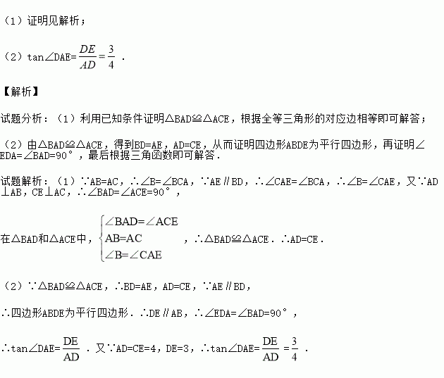如图,在△ABC中,AB=AC,作AD⊥AB交BC的延长线于点D,作CE⊥AC,且使AE∥BD,连结DE.