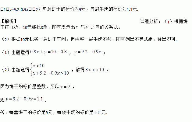 如果每盒饼干和每袋牛奶的标价分别设为x元,y元,请你根据以上信息,回答以下问题: