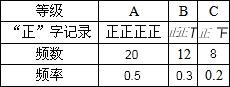 因为“C级”的“频率”为0.2,所以频数为40×0.2=8,“C级”的“划记”为“两个正字少两画”.