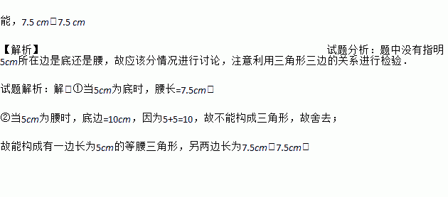 用一条长为20 cm的细绳围成一个等腰三角形,能围成有一边的长是5 cm的等腰三角形吗?如果能,求出其他两边的长;如果不能,说明理由