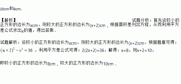 如果两个正方形的周长相差8cm,它们的面积相差36cm2,则这两个正方形的边长分别是多少?