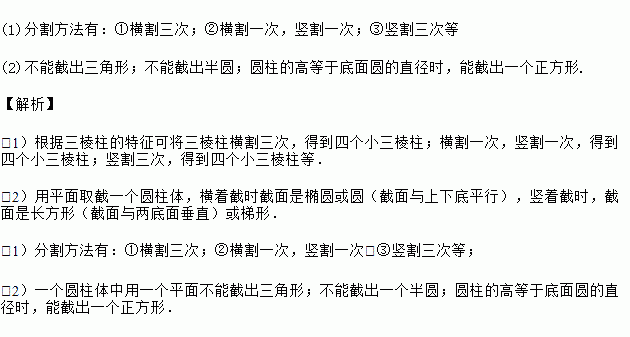 (1)把一个三棱柱分割成四个小三棱柱,你能找出多少种不同的分割方法?请把你的想法与同伴进行交流;