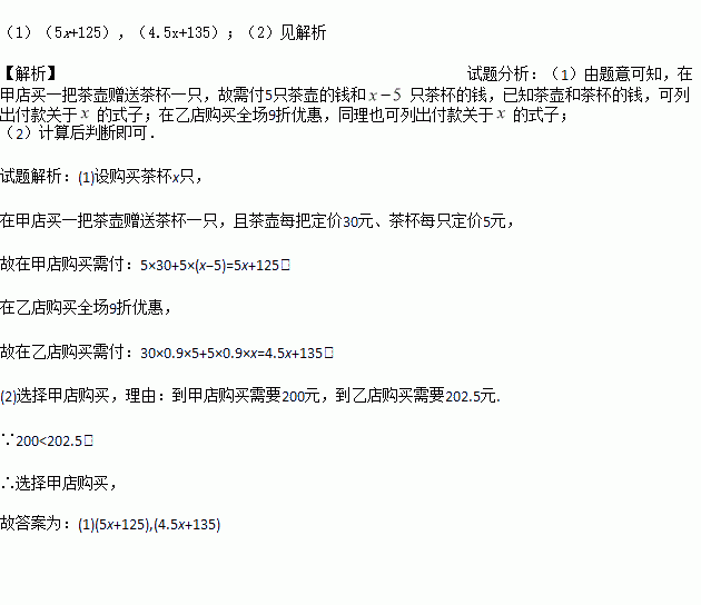 周末小明陪爸爸去陶瓷商城购买一些茶壶和茶杯,了解情况后发现甲、乙两家商店都在出售两种同样品牌的茶壶和茶杯,定价相同:茶壶每把定价30元,茶杯每只定价5元.两家都有优惠:甲店买一送一大酬宾(买一把茶壶赠送茶杯一只);乙店全场9折优惠.小明爸爸需茶壶5把,茶杯x只(x不小于5).