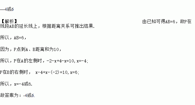 已知数轴上A、B两点对应数分别为—2、4,P为数轴上一动点,对应数为x,若P点到A、B距离和为10,则x的值为______________.