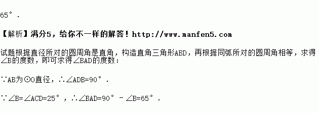 如图,AB为⊙O直径,CD为⊙O的弦,∠ACD=25°,∠BAD的度数为 .