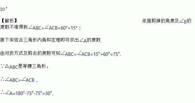 如图,将一个等腰三角形(底角大于60°)沿对称轴对折后,剪掉一个60°的角,展开后得到如图的形状,若∠ABD=15°,则∠A=_____.